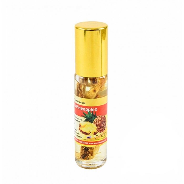 Тайский ингалятор с ананасом — это популярное натуральное средство от укачивания, головной боли и насморка, очень приятно пахнущий и дополнительно настоянный на свежем ананасе.